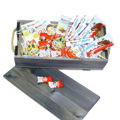 В составе деревянный ящик собственного производства (цвет фиолетовый), 2 Киндер-сюрприза, 1 Киндер Джой, 6 конфет Киндер мини, 1 Киндер со злаками, 2 Киндер Делиз, 4 Киндер Макси, 2 Киндер Т4