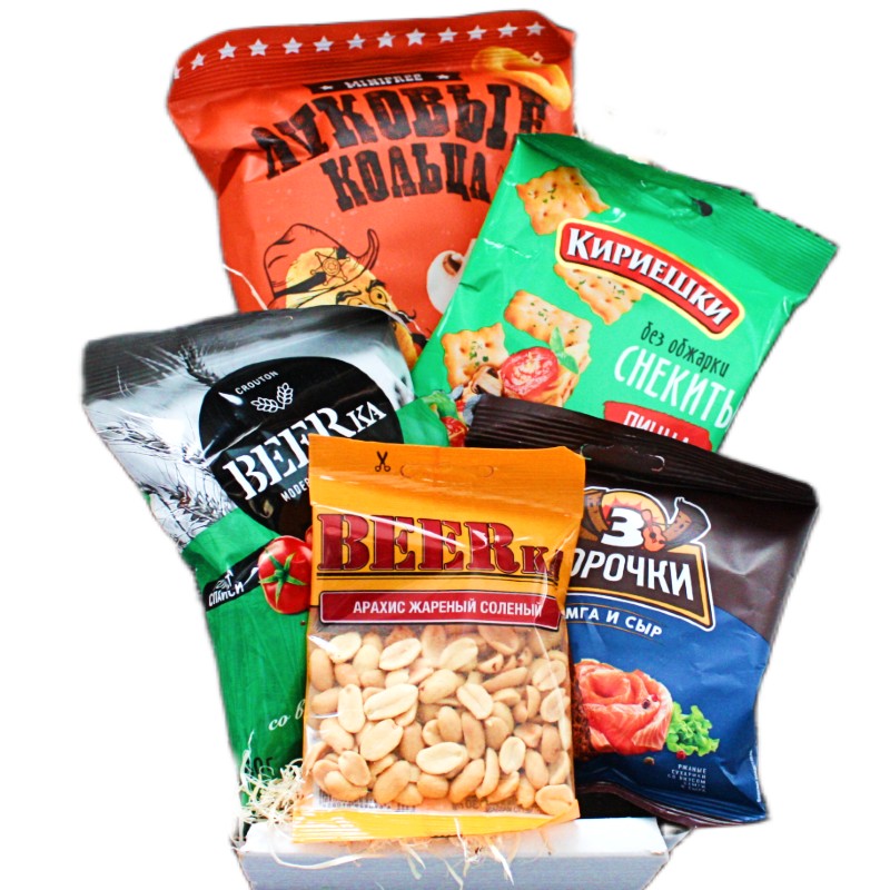 Подарочный набор для мужчин в виде ассорти из пяти разных закусок к пиву: