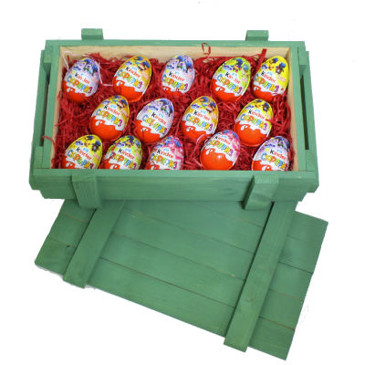 В составе деревянный ящик нашего производства (цвет зеленый), 14 киндер-сюрпризов, декор