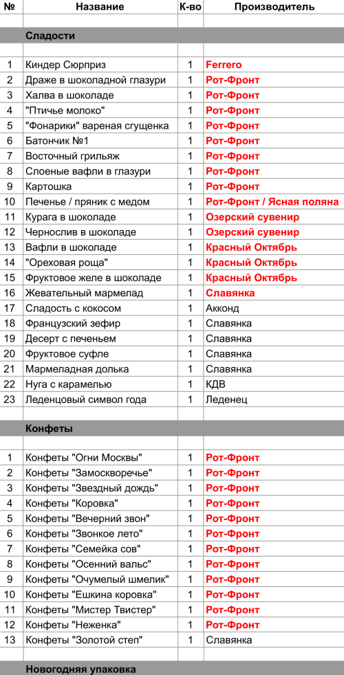 Драже в шоколадной глазури (1 шт), Халва в шоколаде (1 шт), "Птичье молоко" (1 шт), "Фонарики" вареная сгущенка (1 шт), Батончик №1 (1 шт), Восточный грильяж (1 шт), Слоеные вафли в глазури (1 шт), Картошка (1 шт), Печенье / пряник с медом (1 шт), Конфеты "Огни Москвы" (1 шт), Конфеты "Замоскворечье" (1 шт), Конфеты "Звездный дождь" (1 шт), Конфеты "Коровка" (1 шт), Конфеты "Вечерний звон" (1 шт), Конфеты "Звонкое лето" (1 шт), Конфеты "Семейка сов" (1 шт), Конфеты "Осенний вальс" (1 шт), Конфеты "Очумелый шмелик" (1 шт), Конфеты "Ешкина коровка" (1 шт), Конфеты "Мистер Твистер" (1 шт), Конфеты "Неженка" (1 шт)