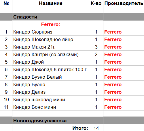 Киндер Сюрприз (2 шт),  Киндер Макси 21 г. (3 шт),  Киндер Кантри (со злаками) (2 шт),  Киндер Джой (1 шт),  Киндер Шоколад 8 плиток 100г. (1 шт),  Киндер Бонс (1 шт),  Киндер Буэно (1 шт),  Киндер Делис (1 шт)