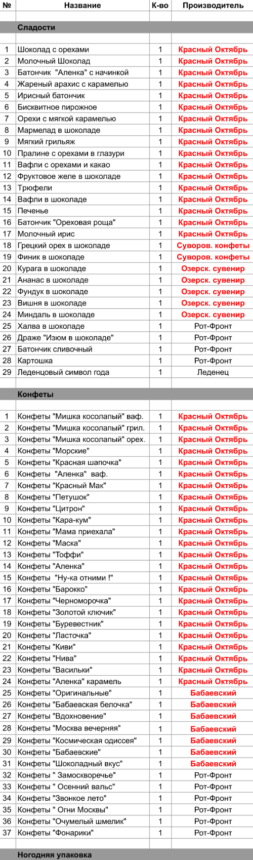 Шоколад с орехами (1 шт), Молочный Шоколад (1 шт), Батончик "Аленка" с начинкой (1 шт), Жареный арахис с карамелью (1 шт), Ирисный батончик (1 шт), Бисквитное пирожное (1 шт), Орехи с мягкой карамелью (1 шт), Мармелад в шоколаде (1 шт), Мягкий грильяж (1 шт), Пралине с орехами в глазури (1 шт), Вафли с орехами и какао (1 шт), Фруктовое желе в шоколаде (1 шт), Трюфели (1 шт), Вафли в шоколаде (1 шт), Печенье (1 шт), Батончик "Ореховая роща" (1 шт), Молочный ирис (1 шт), Конфеты "Мишка косолапый" ваф. (1 шт), Конфеты "Мишка косолапый" грил. (1 шт), Конфеты "Мишка косолапый" орех. (1 шт), Конфеты "Морские" (1 шт), Конфеты "Красная шапочка" (1 шт), Конфеты  "Аленка"  ваф. (1 шт), Конфеты "Красный Мак" (1 шт), Конфеты "Петушок" (1 шт), Конфеты "Цитрон" (1 шт), Конфеты "Кара-кум" (1 шт), Конфеты "Мама приехала" (1 шт),Конфеты "Маска" (1 шт), Конфеты "Toффи" (1 шт), Конфеты "Аленка" (1 шт), Конфеты  "Ну-ка отними !" (1 шт), Конфеты "Барокко" (1 шт), Конфеты "Черноморочка" (1 шт), Конфеты "Золотой ключик" (1 шт), Конфеты "Буревестник" (1 шт), Конфеты "Ласточка" (1 шт), Конфеты "Киви" (1 шт), Конфеты "Нива" (1 шт), Конфеты "Васильки" (1 шт), Конфеты "Аленка" карамель (1 шт)